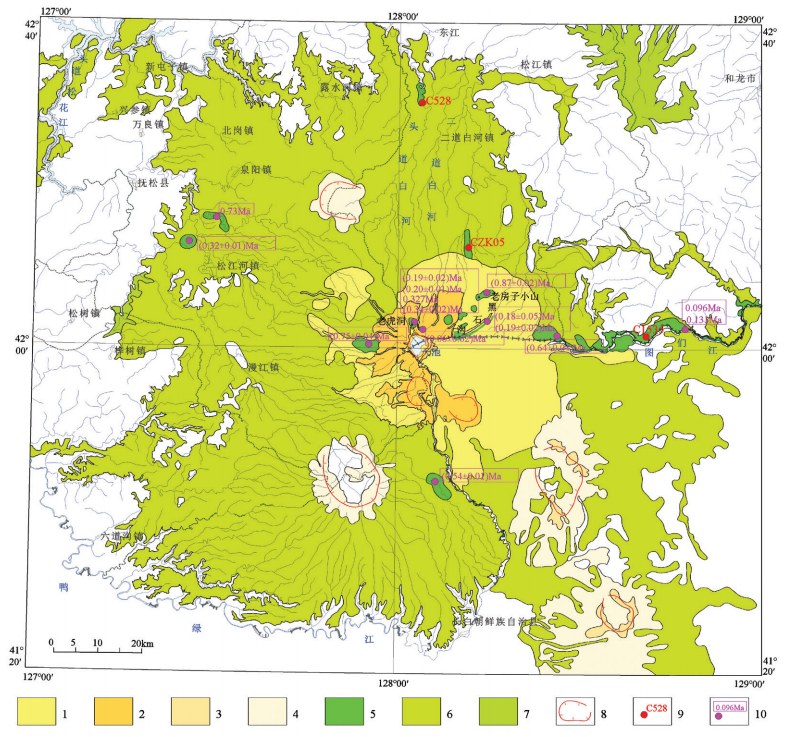 长白山天池火山位于吉林省东部的中朝边境地区,晚新生代以来持续活动,火山灾害巨大,为地球上最大的活火山之一[1]。20世纪60年代,在长白山地区开展了漫江幅和长白幅1:20万区域地质调查,初步揭开了长白山火山的神秘面纱。20世纪80年代以来,学者们针对天池火山的成因、形成过程、岩浆演化、活动期次、喷发机制等进行了大量研究,并取得了一系列的成果[1-17]。刘若新等针对天池火山的形成演化进行了较为系统的总结,认为其相继经历了玄武质火山岩造盾阶段、粗面质火山岩造锥阶段和碱流质火山大爆发阶段3个演化过程[5]。有学者对各过程的形成时代和特征进行总结,上新世-早更新世早期的玄武质火山活动形成天池火山下部及其周边的玄武岩盾[5, 6, 12, 18],形成时间为4.5~1.2 Ma[5, 16];早更新世晚期-晚更新世中心式粗安-粗面质火山活动形成天池火山锥的主体[2, 6, 7],形成时间为1.0~0.01 Ma[5, 14-15, 19];全新世中心式粗面-碱流质爆炸式火山活动,形成天池火山锥体上大面积分布的火山碎屑流堆积和空降堆积、及锥体周边主要沿河谷分布的火山泥石流堆积[2, 5, 12]。