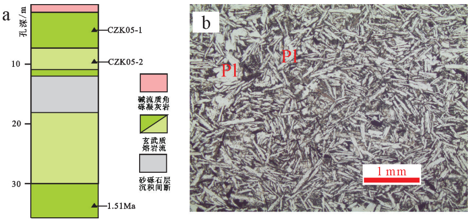 图 3 CZK05岩心柱状图和显微薄片照片 Fig.3 CZK05 drilling core columnar and micro-section photo a-CZK05钻岩芯及采样位置;b-CZK05-1显微薄片特征,单偏光;Pl-斜长石 a-CZK05 drilling core columnar and sampling position; b-CZK05-1 micro-section (plainlight); Pl-Plagioclase |