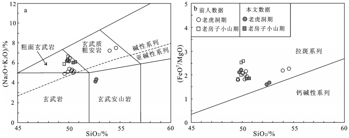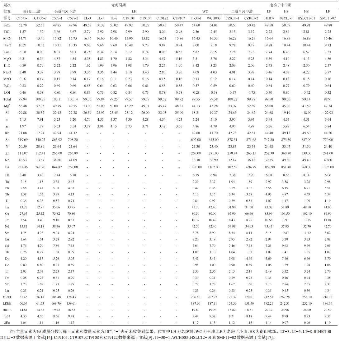 (2)老房子小山期玄武岩为碱性岩石系列,岩性为粗面玄武岩;老虎洞期玄武岩大部分为碱性岩石系列,个别为拉斑岩石系列,岩性为粗面玄武岩、玄武粗安岩、碱性玄武岩和玄武安山岩。碱性系列玄武岩呈现高Al、Ti、K、P和低Mg特征;拉斑系列玄武岩呈现高Mg、富Fe、Ca和低Na特征。两期玄武岩的稀土元素配分曲线呈右倾型,略显正铕异常,富集大离子亲石元素Ba、K、Pb和高场强元素P和Ti,亏损高场强元素Th、U及大离子亲石元素Sr;但拉斑系列玄武岩的稀土含量较低且轻重稀土分馏较弱,此外,除Y、Yb和Lu外其他微量元素的含量明显低于碱性系列岩石。