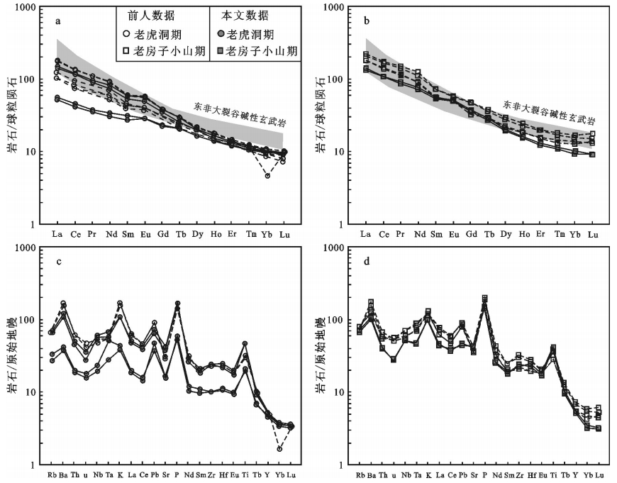老房子小山期和老虎洞期玄武岩的稀土元素具有相似的配分曲线特征,呈右倾型,略显正铕异常,但碱性系列玄武岩的配分曲线较拉斑系列的右倾斜率偏大(图 5-a、b)。两期碱性玄武岩的曲线特征与东非大裂谷碱性玄武岩的形态相似,老房子小山期表现更为明显(图 5-a、b)。与两期碱性系列玄武岩相比,老虎洞期拉斑系列玄武岩的稀土含量较低、且轻重分馏较弱。而针对两期碱性系列玄武岩而言,稀土总量和轻、重稀土含量较一致;轻重稀土分馏特征较为一致,均表现分馏较强,LREE/HREE介于8~9.5、(La/Yb)N介于13~19。老虎洞期玄武岩略显正铕异常(包括拉斑系列)(δEu=1.04~1.17),而老房子小山期主体略显正铕异常(δEu=1.1~1.14),个别样品铕异常不明显(δEu=0.96和0.97)。