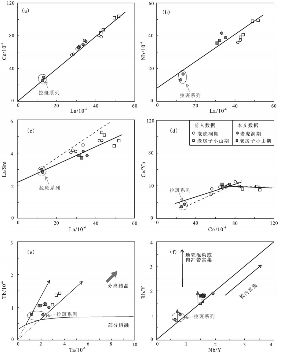 图 6 La-Ce、La-Nb、La-La/Sm、Ce-Ce/Yb、Ta-Tb及Yb/Y-Rb/Y相关图(前人数据来源见表 3),(c、d虚线来源于[9]) Fig.6 Plots of La versus Ce, La versus Nb, La versus La/Sm, Ce versus Ce/Yb, Ta versus Tb and Yb/Y versus Rb/Y (data after Table 3; Trend lines in c and d after [9]) |