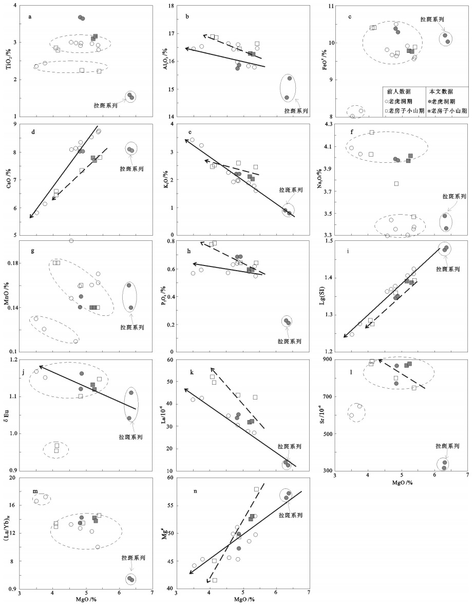 图 7 MgO与其他主量元素、部分微量元素及特征参数的相关图(前人数据来源见表 3) Fig.7 Plots of major elements, some trace elements and characteristic parameters against MgO (data after Table 3) 实线箭头代表老虎洞期岩浆演化趋势;虚线箭头表示老房子小山期岩浆演化趋势 Real lines are evolution trends of magma at Laohudong stage, dashed lines are evolution trends of magma at Laofangzixiaoshan stage |