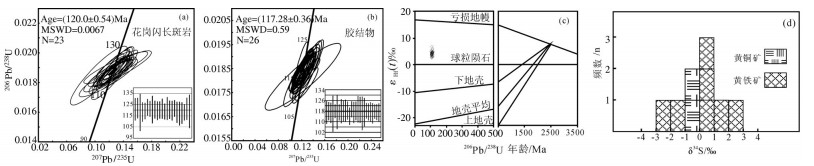 图 1 拿若矿床隐爆角砾岩锆石谐和年龄、Hf同位素及硫同位素组成 Figure 1 Concordia diagrams (a, b), Hf isotope composition (c) of zircons and S isotope composition (d) of sulfide from the cryptoexplosive breccias of the Naruo ore deposit |