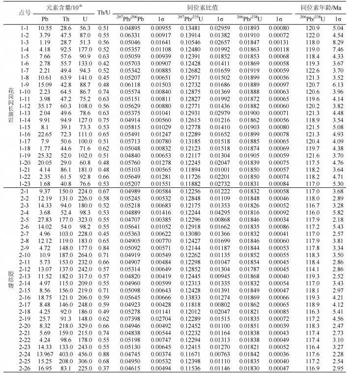 表 1 隐爆角砾岩花岗闪长斑岩和胶结物LA-ICP-MS锆石U-Pb年龄分析结果 Table 1 LA-ICP-MS zircon U-Pb analyses of granite porphyry and cement from cryptoexplosive breccia |