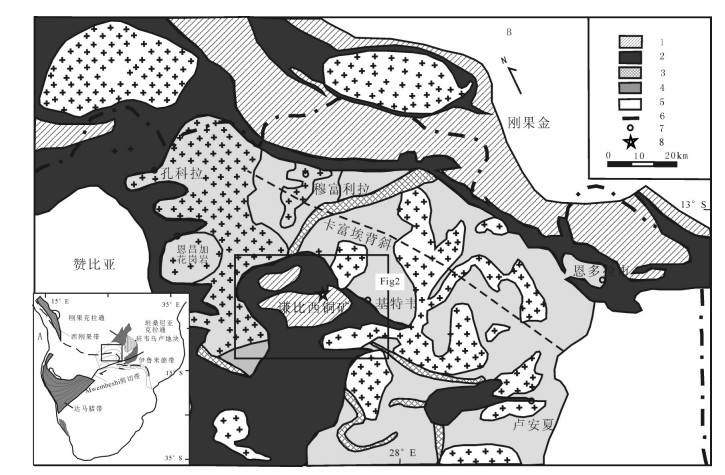 图 1 谦比西铜矿区域地质简图(A—大地构造位置;B—区域地质简图) 1—昆德隆古群;2—罗安群; 3—穆瓦岩系; 4—卢富布片岩; 5—花岗岩; 6—国界; 7—城市; 8—取样位置 Figure 1 Simplified geological map of the Chambishi copper mine(A-Tectonic location; B-Simplified regional geological map) 1-Kundelungu Group; 2-Roan Group; 3-Muva System; 4 Lufubu schist; 5-Granite; 6-Country boundary; 7-City; 8-Sampling location |