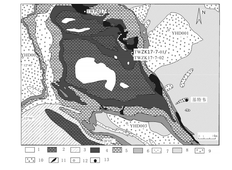 图 2 谦比西铜矿地质简图及取样位置 1—中上昆德古龙组砂、页岩夹石英岩;2—下昆德古龙组灰岩、冰碛岩;3—木瓦夏板岩;4—上罗安组泥岩;5—上罗安组白云岩;6—下罗安组砂质砂岩、泥岩夹石英岩互层;7—穆瓦系变质砂砾岩;8—卢富布片岩;9—辉长岩;10—谦比西花岗岩;11—谦比西矿体;12—取样位置;13—城镇 Figure 2 Simplified geological map of the Chambishi copper mine and sampling positions 1-Sandstone and shale intercalated with quartzite, upper and middle Kundelungu Formation; 2-Limestone and tillite of Lower Kundelungu Formation; 3-Mwashia slate; 4-Upper Roan mudstone; 5-Upper Roan dolomite; 6-Lower Roan sandy mudstone interbedded with quartzite; 7-Muwa metamorphic conglomerate; 8-Lufubu schist; 9-Gabbro; 10-Chambishi granite; 11-Chambishi orebody; 12-Sampling location; 13-Town |