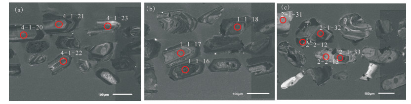 图 3 锆石阴极发光照片(a-样品TWPd174;b-样品TWZK17-7-01;c-样品TWZK17-7-02) Figure 3 Zircon Cl image of three samples (a-TWPd174; b-TWZK17-7-01; c-TWZK17-7-02) |