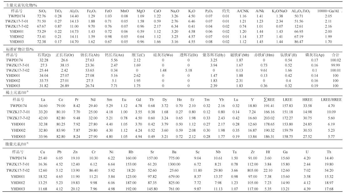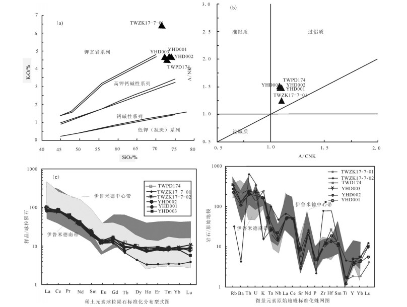 本文还对所取样品进行了全岩地球化学测试,其结果见表 2。其中除TWZK17-7-02样品外,其余花岗岩样品以具有较高的SiO2含量(71.50%~73.41%),较富的全碱含量(7.71%~9.22%)、较高的K2O/Na2O(1.38~2.34)比值为特征(图 5a)。在成分上属高钾钙碱到钾玄岩系列的花岗岩(图 5b)。具有较高的铝饱和指数(1.44~1.60),较低的样品CIPW分异指数(86.4~88.68),较高的CIPW刚玉分子数(1.59~2.04),总体上为一套分异程度较低的弱过铝质花岗岩。