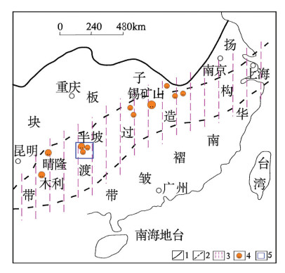图 1 华南锑矿带及其主要锑矿床分布图(据肖启明等,1992修改) 1—一级单元界线;2—次级单元界线;3—锑矿主要分布区;4—主要锑矿床;5—独山锑矿集区 Figure 1 Distribution of South China antimony belt and its main antimony deposits (modified after Xiao et al., 1992) 1-First unit boundary; 2-Secondary unit boundary; 3-The main distribution area of antimony ore; 4-Main antimony deposit; 5-Dushan antimony ore concentration area |