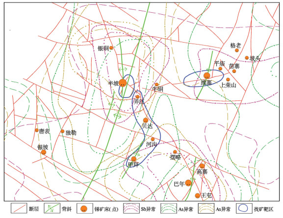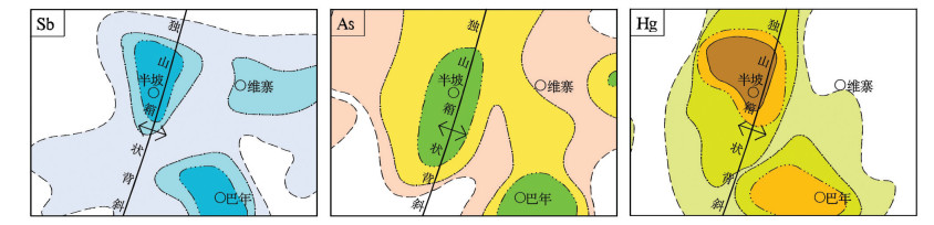 Sb、As、Hg岩石地球化学异常形态及分布范围相似,异常呈椭圆状集中分布于以半坡—巴年为中心的独山箱状背斜轴部(图 5),异常浓集中心为轴部的半坡、偏东南翼的巴年和维寨地区,与半坡锑矿、巴年锑矿和维寨锑矿矿区边界范围吻合(图 5)。异常沿主要断裂构造呈不规则带状、串珠状,局部呈不规则面状展布。