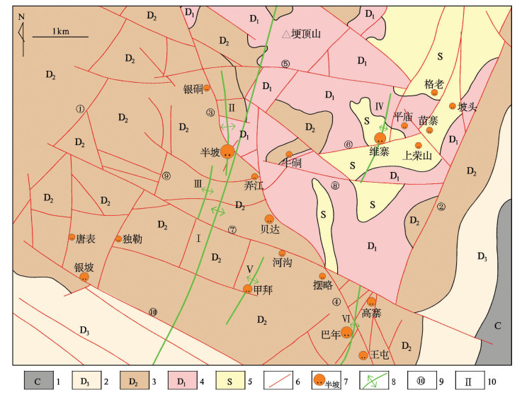 图 2 独山锑矿集区地质及矿床(点)分布图(据王学锟等,1994改编) 1—石炭系;2—上泥盆统;3—中泥盆统;4—下泥盆统;5—志留系;6—断层;7—锑矿床(点)及名称;8—背斜;9—断层编号;10—背斜编号;①—独山断裂;②—烂土断裂;③—半坡断裂;④—巴年断裂;⑤—大草山断裂;⑥—牛硐断裂;⑦—河沟断裂;⑧—摆独断裂;⑨—马尾沟断裂;⑩—银坡断裂;Ⅰ—独山箱状背斜;Ⅱ—半坡背斜;Ⅲ—贵修背斜;Ⅳ—蕊燃沟背斜;Ⅴ—甲拜背斜;Ⅵ—巴年背斜 Figure 2 Geological map of the Dushan antimony ore concentration area showing distribution of mineral deposits (modified after Wang et al., 1994) 1-Carboniferous strata; 2-Upper Devonian strata; 3-Middle Devonian strata; 4-Lower Devonian strata; 5-Silurian strata; 6-Fault; 7-Antimony deposit and its name; 8-Anticline; 9-Fault number; 10-Anticline number; ①-Dushan fault; ②-Lantu fault; ③-Banpo fault; ④-Banian fault; ⑤-Dacaoshan fault; ⑥-Niudong fault; ⑦-Hegou fault; ⑧-Baidu fault; ⑨-Maweigou fault; ⑩-Yingpo fault; Ⅰ-Dushan box-shaped anticline; Ⅱ-Banpo anticline; Ⅲ-Guixiu anticline; Ⅳ-Ruirangou anticline; Ⅴ-Jiabai anticline; Ⅵ-Banian anticline |