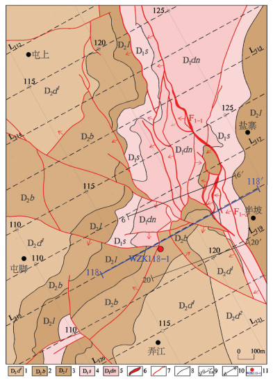 图 3 半坡锑矿床综合地质图(据贵州省有色金属和核工业地质勘查局五总队,2015改编) 1—独山组鸡泡段;2—邦寨组;3—龙洞水组;4—舒家坪组;5—丹林组;6—锑矿体;7—断层;8—地层界线;9—CSAMT剖面线及编号、测点;10—勘探线;11—验证见矿钻孔 Figure 3 Comprehensive geological map of the Banpo antimony deposit (modified after No. 5 Geological Party of Non-ferrous Metals and Nuclear Industry Geological Exploration Bureau of Guizhou, 2015) 1-Jipaomem section of Dushan Formation; 2-Bangzhai Formation; 3-Longdongshui Formation; 4-Shujiaping Formation; 5-Danlin Formation; 6-Antimony orebody; 7-Fault; 8-Stratigraphic boundary; 9-Serial number and measuring points of CSAMT profile; 10-Exploration line; 11-Ore-intersecting drill hole |