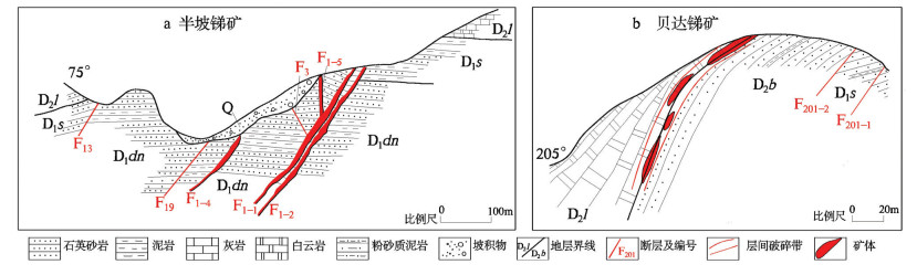 锑矿体主要呈脉状、透镜状、似层状产出。脉状锑矿以半坡锑矿床为代表(图 4a),透镜状、似层状锑矿以巴年锑矿床、贝达锑矿床为代表(图 4b),维寨锑矿床矿体呈脉状、透镜状产出。