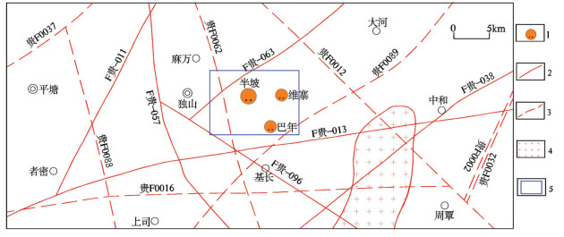 图 6 重力及航磁推断地质构造图(据贵州省地质调查院,2010改编) 1—锑矿床(点);2—重力推断断裂;3—航磁推断断裂;4—推断酸性岩体;5—独山锑矿集区 Figure 6 The inferred geological structure map of gravity and aeromagnetic survey (modified after Guizhou Geological Survey, 2010) 1-Antimony deposit; 2-Inferred structure of gravity survey; 3-Inferred structure of aeromagnetic survey; 4-Inference acidic rock body; 5-The Dushan antimory ore Concentration area |