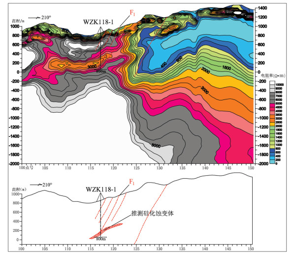 (5)地球物理标志(大地音频电磁测深):大地音频电磁测深解译的封闭高阻等值线附近相对低阻区域为找矿重要区域。CSAMT解译封闭高阻体+断层为重要地球物理找矿标志。