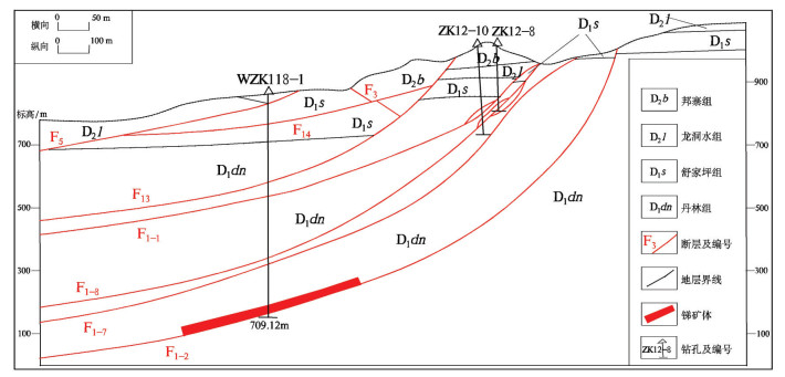 图 4 独山锑矿集区典型地质剖面图 Figure 4 Typical geological profile of the Dushan antimony ore concentration area |