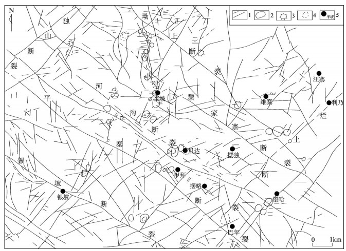 桂林工学院(1994,未刊资料)对独山锑矿集区360 km2 1:1万航片解译表明本区线性构造、环形构造发育。线性构造成网络状,多为断裂反映,可分为NE-SW、NW-SE、SN和EW向4组断裂(图 9)。NE-SW向线性构造以独山断裂、烂土断裂为代表,与区域构造相吻合。NW-SE向线性构造发育,影像特征表现为规模大、延伸长、断裂多、近平行展布,以银坡、河沟断裂为代表,该方向线性构造与EW向线性构造交汇处常出现环形影像构造。EW向线性构造线性体短而粗、连续性差,一般不超过100 m,小线性体常在NW向断裂北盘呈近平行密集分布,密集区常出现环形影像构造。SN向线性构造不明显,半坡地区有多个环形影像构造沿该组线性构造分布。本区环形影像构造发育(图 9),形迹明显,单个小环形体呈群环展布,属低级序列的环形构造,主要特征:(1)环形构造形态多为独立环形构造、呈浑圆状或椭圆状。(2)环形构造常出现在NW向线性构造(断裂)北盘,以NW向与EW向线性构造交汇处居多,排列方向多呈SN和EW向。(3)环形构造呈规律性与部分已知锑矿床(点)位置重合,如半坡锑矿床环形构造清晰,向北至梅子湾,形成SN向环形构造密集带。