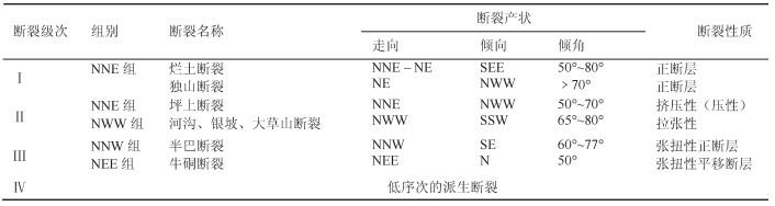 断裂构造是在箱状背斜两翼及核部发育有成生关系的断裂构造体系,按断裂规模分四级(表 1):一级断裂构造为区域控矿构造,控制着独山锑矿集区内锑矿规模和格局;二级断裂构造主要为导矿构造、部分为容矿构造;三级断裂构造与箱状背斜轴斜交呈“X”型断裂,NNW向以半坡—巴年断裂为代表,NNE向以牛硐断裂为代表,具多期活动特征,为赋矿断裂构造,控制锑矿床产出和展布。四级断裂构造多为二级、三级断裂或褶皱所派生的羽状次级断裂或层间破碎带与层间滑动等低序次的断裂构造,规模小、成群成带分布,多为容矿构造,控制矿体形态产状和规模,在巴年锑矿床、贝达锑矿床中较为明显。