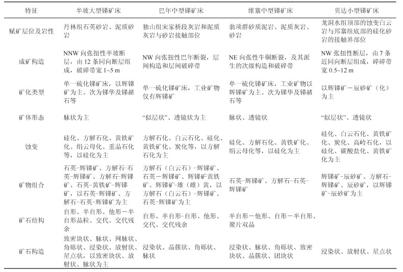 2.3 矿体地质独山锑矿集区内锑矿床可分为3种控矿类型:(1)直接产于断层破碎带及影响带内的脉状锑矿床,以半坡大型锑矿为代表;(2)沿层间破碎带充填,呈透镜状、囊状、似层状产出的层控型锑矿床,以巴年中型锑矿床、贝达锑矿床为代表;(3)以上两者兼有的混合控矿型,以维寨锑矿为代表。矿集区内典型矿床的矿体地质特征见表 2。