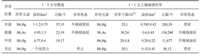 3 地球化学特征 3.1 土壤地球化学半坡锑矿床采样层位及粒级试验表明Sb、Hg元素在土壤B层富集特征明显,元素在B层中细粒组分中的含量高于粗粒组分中的含量。1:1万土壤地球化学测量Sb异常特征表明:(1)主要异常区有半坡、维寨、甲拜、贝达(表 3)。(2)异常区元素异常为Sb、Hg,一般Sb异常面积和强度均大于其他元素异常。(3)异常多分布于独山箱状背斜核部碎屑岩中,沿构造呈线状或带状分布。(4)土壤地球化学异常与分散流异常分布区域基本吻合,土壤地球化学异常是锑矿化带、矿化体、成矿断裂、围岩蚀变带的反映。
