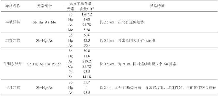 (4)地球化学标志:呈线状或带状展布的Sb、Hg及其组合元素地球化学异常,沿断裂、层间破碎带及其构造复合部位分布呈线状或带状的Sb、Hg、As及其组合构造地球化学异常为直接的地球化学找矿标志,为重要找矿标志。