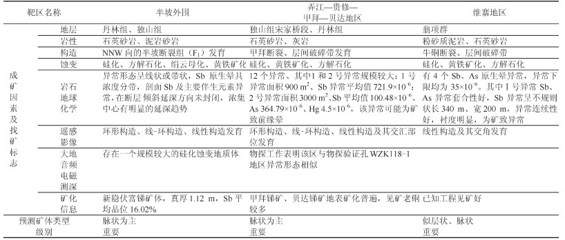 表 5 独山锑矿集区锑矿找矿靶区综合特征 Table 5 Comprehensive characteristics of antimony ore prospecting targets of the Dushan antimony ore concentration area |