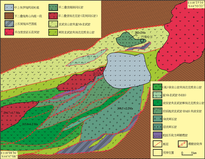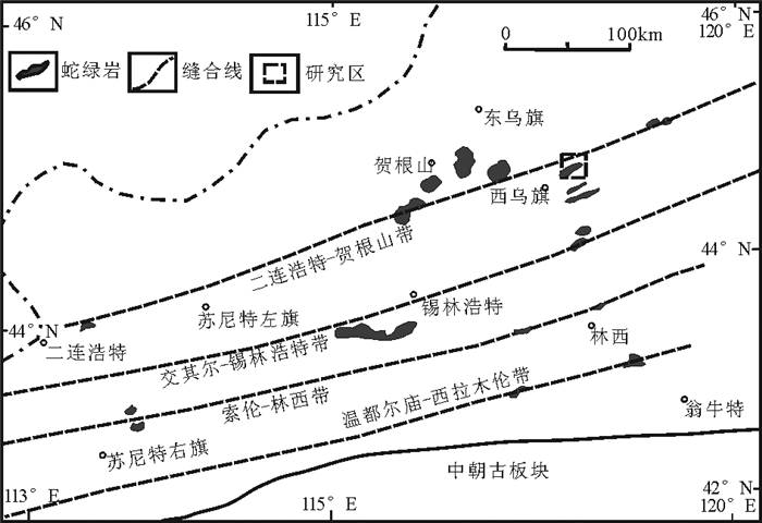 中亚造山带东段内蒙古二连—贺根山缝合带,广泛发育有近东西向的古生代蛇绿岩(带)和俯冲岛弧型-后造山型岩浆岩(梁日暄,1994;Miao et al., 2008;刘建峰等,2009;Xiao et al., 2009;Liu et al., 2013;石玉若等,2014;李英杰等, 2012, 2013, 2015, 2018;康健丽等,2016;王金芳等, 2017a, 2017b, 2018a, 2018b;Li et al., 2018a, 2018b),特别是发育早石炭世—晚石炭世SSZ型蛇绿岩与石炭纪—二叠纪岛弧型岩浆岩,识别与研究岛弧型岩浆岩与SSZ型蛇绿岩等地质体之间的时空分布与内在成因关系,可能为古亚洲洋二连—贺根山晚古生代洋盆扩张时限和大洋俯冲作用与过程提供某些岩石学证据与时间约束。内蒙古中部西乌旗地区为二连—贺根山缝合带出露较广和发育较好的典型地区(图 1),有关岛弧型岩浆岩形成时代的报道主要为早石炭世—晚二叠世(陈斌等,2001;刘建峰等,2009;张玉清,2009;康健丽等,2016),而侵位于贺根山缝合带蛇绿岩之中的早二叠世岛弧型高镁闪长岩体尚未见有报道。二连—贺根山洋盆大洋扩张起止时间和大洋俯冲作用与过程等尚缺乏进一步的岩石学和年代学证据与约束。