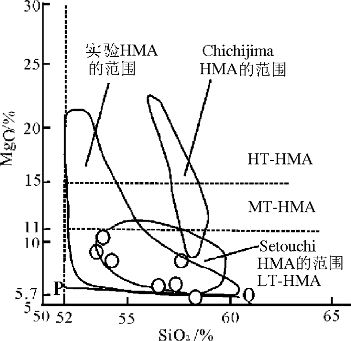 总之,地球化学属性表明,巴嘎哈尔闪长岩为高镁闪长岩,可与日本Setouchi火山带的岛弧高镁安山岩/高镁闪长岩(HMA)相对比(图 10,图 11)(Shimoda et al., 1998;Tatsumi et al., 2003;Kamei et al., 2004;张旗等,2005;王强等,2006;唐功建等,2010;邓晋福等,2010;赵少卿等,2015)。例如,在SiO2-MgO和FeO*/MgO-SiO2图解中,样品投点基本位于日本Setouchi火山带的岛弧高镁安山岩/高镁闪长岩(HMA)范围和实验给出的高镁安山岩/高镁闪长岩HMA范围内(图 10,图 11)(Viruete et al., 2007;邓晋福等,2010)。