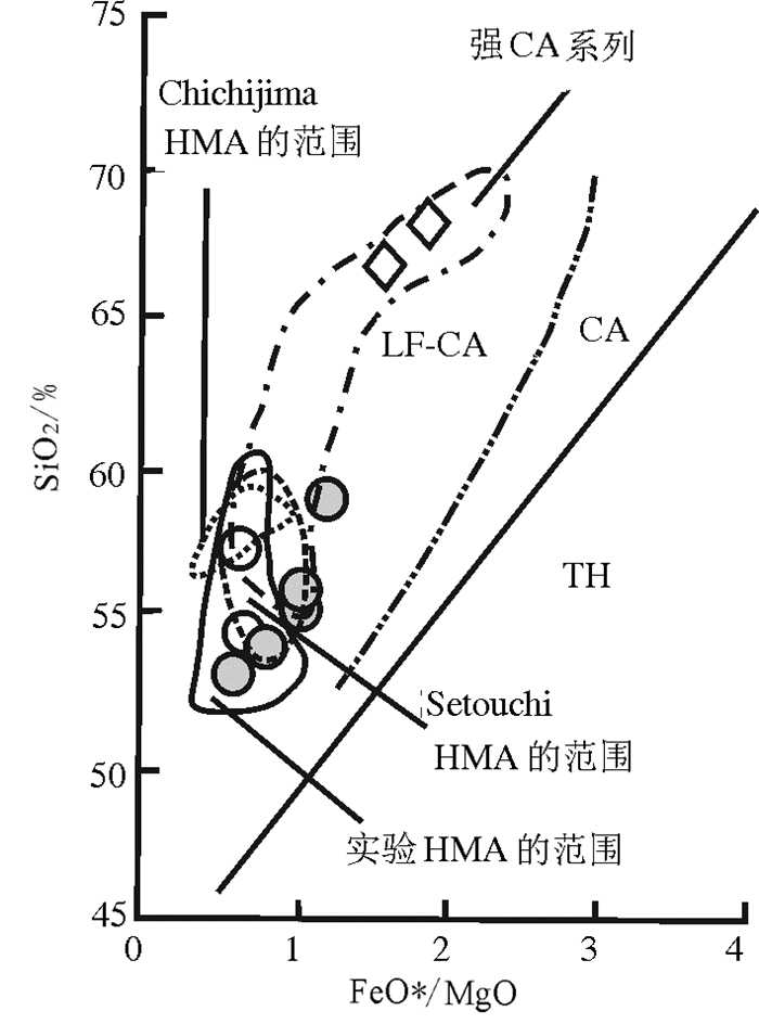 图 11 高镁闪长岩(HMA)的FeO*/MgO-SiO2图(岩性符号同图 6)(Deng et al., 2009;2017) Figure 11 FeO*/MgO versus SiO2 diagrams of the Bagahaer high-Mg diorites (symbols as for Fig. 6() after Deng et al., 2009; 2017) |