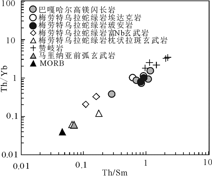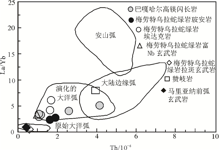 在Th-La/Yb构造判别图解中(图 13)(李奋其等,2016),巴嘎哈尔高镁闪长岩5个样品投点均落入演化的大洋弧区内,与梅劳特乌拉SSZ型蛇绿岩的玻安岩(高镁安山岩)和埃达克岩(花岗闪长岩)投点区相吻合,与赞岐岩投点相对应(Tatsumi et al., 2003)。梅劳特乌拉SSZ型蛇绿岩的枕状低钾拉斑玄武岩与马里亚纳前弧玄武岩(FAB)投点重叠于原始大洋弧区内(图 13)(Reagan et al., 2010)。这些特征表明该闪长岩可能产于洋内弧环境,为梅劳特乌拉SSZ型蛇绿岩的枕状低钾拉斑玄武岩和玻安岩岩浆演变稍晚侵位的深成侵入岩。