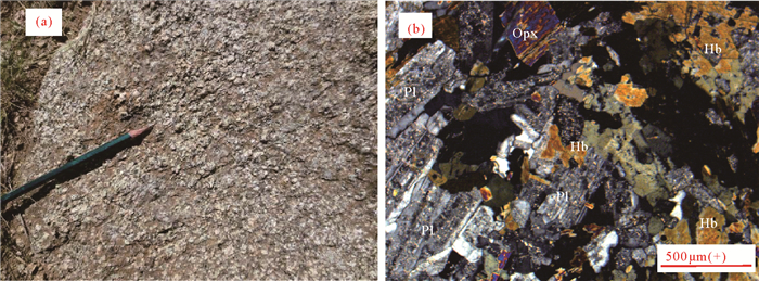 图 4 巴嘎哈尔高镁闪长岩野外露头(a)和正交偏光显微照片(b) a—中粒闪长岩野外露头;b—细粒半自形粒状结构;Pl—斜长石;Hb—角闪石;Opx—斜方辉石 Figure 4 Outcrop(a) and transmitted light photomicrograph (b) of the Bagahaer high-Mg diorite a-Outcrop of the medium grained diorite; b-Fine-grained subhedral granular texture; Pl-Plagioclase, Hb-Hornblende; Opx-Orthopyroxene |
