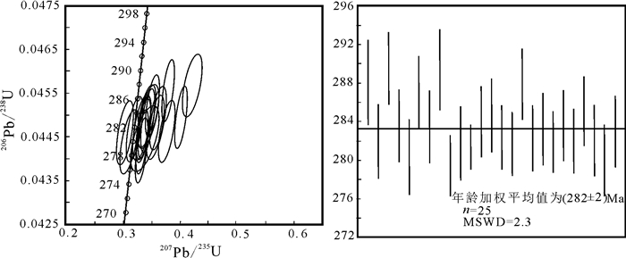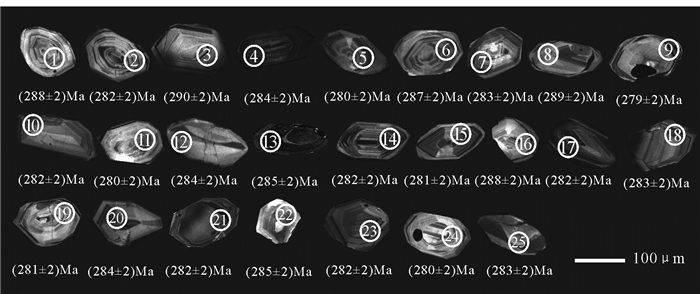 3.2 测试结果巴嘎哈尔岩体样品(S18)共选取25粒锆石进行测定,所选锆石阴极发光图像(CL)显示岩石中的锆石结构均一,呈自形—半自形双锥状,长宽比为1:1~ 2:1,具明显的条带环状结构,为中性岩浆成因锆石的特征(Claesson et al., 2000)。25粒锆石的U与Pb含量分别介于234×10-6~1219×10-6和11×10-6~61× 10-6,Th/U比值在0.06~0.72(表 1),平均值为0.49,具有岩浆成因锆石特征(Koschek,1993;Claesson et al., 2000;Corfu,2003)。该样品25粒锆石的测点位于震荡环带发育部位,测定数据点均落在谐和线上或附近,206Pb/238U年龄值为279~290 Ma,其加权平均值为(282±2)Ma(MSWD=2.3),代表了闪长岩的成岩年龄(表 1,图 5,图 6)。