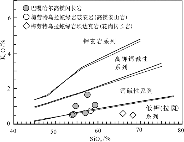 图 7 巴嘎哈尔高镁闪长岩SiO2-K2O分类图解(Peccerillo et al., 1976;王金芳等,2017a Figure 7 SiO2-K2O classification diagrams of the Bagahaer high-Mg diorite(after Peccerillo et al., 1976; Wang et al., 2017a) |