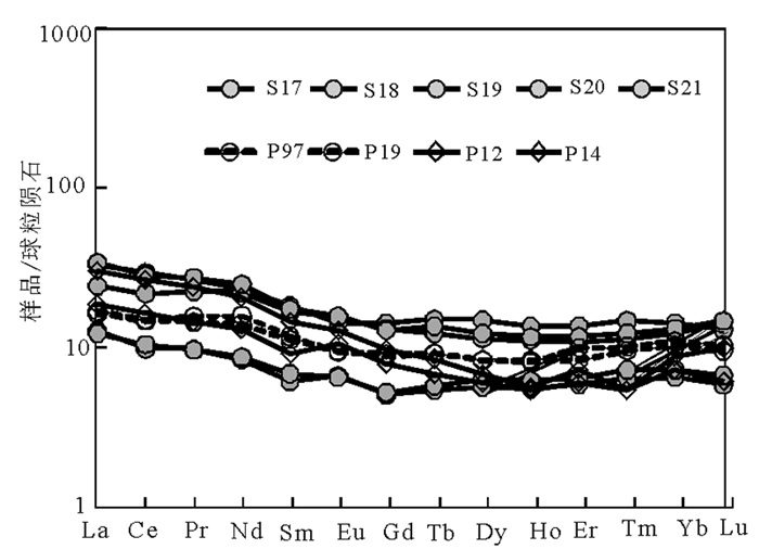 图 8 巴嘎哈尔高镁闪长岩稀土元素球粒陨石标准化配分模式(Boynton, 1984) Figure 8 Chondrite-normalized REE patterns of the Bagahaer high-Mg diorite(after Boynton, 1984) |