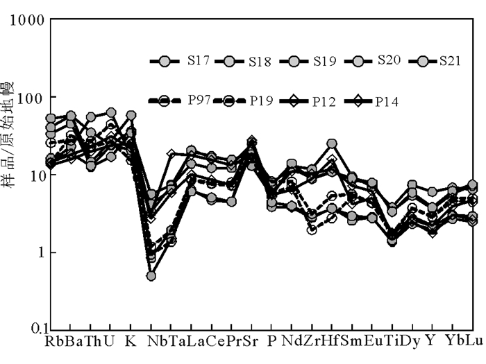 图 9 巴嘎哈尔高镁闪长岩微量元素原始地幔标准化蛛网图(Sun et al., 1989) Figure 9 Primitive mantle-normalized trace element spider diagram of the Bagahaer high-Mg diorite(after Sun et al., 1989) |