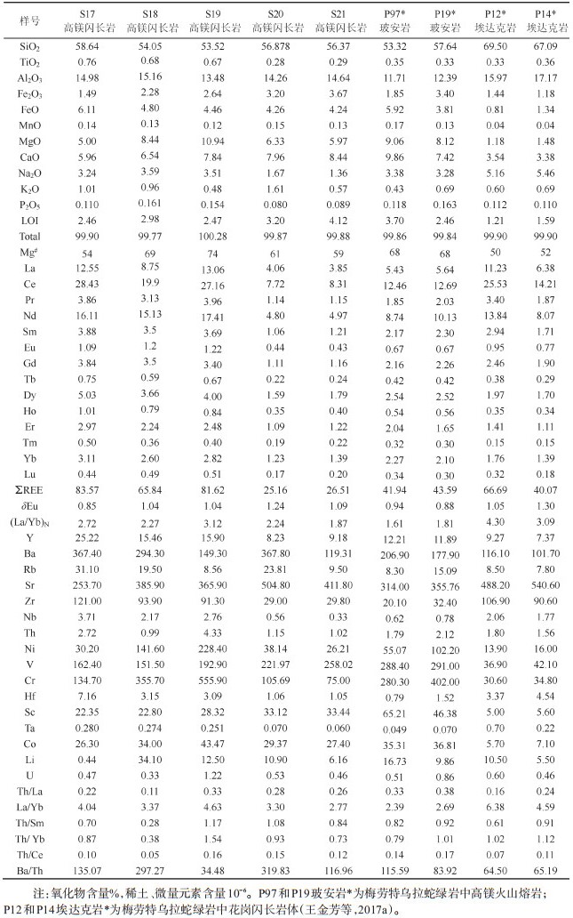 笔者本次在梅劳特乌拉晚石炭世SSZ型蛇绿岩中新识别的俯冲带岛弧型高镁闪长岩,与该地区下二叠统寿山沟组半深海—深海复理石建造反映的大洋俯冲带构造环境相对应(李英杰等,2012;2013;2015;公繁浩等,2013;王金芳等,2017a),也与内蒙古中东部地区中二叠统哲斯组泥岩中发现放射虫化石所反映的古洋盆环境相吻合(Shang,2004),可能揭示了古亚洲洋二连—贺根山洋盆在早二叠世并没有消失,而是正处于洋壳俯冲消减阶段(Miao et al., 2008;Xiao et al., 2009;张玉清,2009;Liu et al., 2013;刘建峰等,2016;李钢柱等,2017;Wang et al., 2017c),或者早二叠世仅仅为二连—贺根山洋盆洋内俯冲阶段,早二叠世之后的一段时间可能为古亚洲洋二连—贺根山洋盆的洋壳俯冲期。