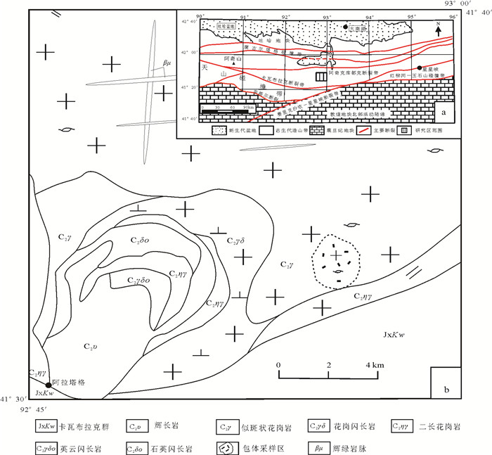 2 地质背景及环状岩体的基本特征阿拉塔格环状岩体所处的大地构造位置为中天山构造带卡瓦布拉克地块,北邻康古尔塔格碰撞带和吐哈盆地南缘古生代岛弧,南邻南天山碰撞带和塔里木地块(图 1a)(李锦轶等, 2006), 是研究区出露规模最大、环状形态保存最好的岩体,因附近发现并开采的阿拉塔格铁矿而著名(图 1b)。