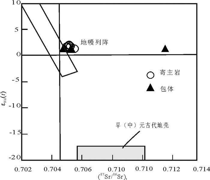对7件包体作了Sr、Nd同位素测试(表 2)。εNd(t)和(87Sr/86Sr)t计算时采用的年龄值为303.7 Ma。包体和寄主岩石的Sr、Nd同位素组成有一定差异,包体87Sr/86Sr比值为0.711102~0.717918,明显小于寄主岩石的87Sr/86Sr比值0.71691~0.72397(余吉远等,2013);包体143Nd/144Nd比值为0.512629~0.512673,稍高于寄主岩石143Nd/144Nd比值0.512584~ 0.512593;包体和寄主岩石的εNd(t)=1.65~ 2.57,全部为正值,显示岩浆来源于亏损型地幔。而包体和寄主岩石的(87Sr/86Sr)t十分相似,分别为0.705204~ 0.705914和0.705615~0.705630,明显高于0.705,显示地幔物源或下地壳物质部分熔融的源区特征。在εNd(t)-(87Sr/86Sr)t图上图 10,可见全部样品落在大洋玄武岩形成的地幔阵列(mantle array)的右侧,Sr素变化明显,而Nd变化不大,Sr-Nd形成近水平的变化趋势。
