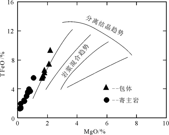 在MgO-TFeO演化图(图 11)上,包体和寄主岩不是沿着玄武岩的结晶分异趋势Ⅰ演化,而是位于幔源岩浆和壳源岩浆混合线附近,且还表现出一定的线性关系,反映了形成包体和寄主岩的岩浆不是同源的,显示出包体与寄主岩的混合关系。另外,包体沿着靠近右侧的基性岩浆和壳源岩浆的混合线分布,表明形成包体的岩浆本身没有发生过明显的分离结晶作用。同时,在岩石硅酸盐成分的哈克图上(图 4)投影点呈连续一致的线性关系,在分离结晶作用中多为曲线,而不会是直线,这些图解中直线分布特征反映它们是岩浆混合作用的产物(邹涛等,2011)。