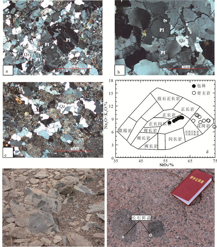 包体的宏观特征:花岗岩体中发育大量暗色包体,可分为捕虏体和岩浆暗色包体两类。捕虏体仅局部出现在岩体的边部,一般为棱角状或不规则状。岩浆暗色包体分布广泛,但分布极不均匀,在似斑状花岗岩体的东南角最为发育,以闪长质包体为主,是本文研究的对象。它们的形态一般为椭球状、浑圆状,大小不一(图 2e),小者粒径不足1 cm,大者可达50 cm,一般为5~15 cm,粒度明显比寄主岩石细小。包体与寄主岩石的界线清晰,有时可见细粒冷凝边,有时可见包体与寄主岩石成过渡关系,也可见二者构成似条带状构造。一般以细粒结构为主,少量半自形中粒结构,块状构造。部分包体中包含有寄主岩石中的长石斑晶(图 2f),表明包体和寄主岩石代表两种共存但成分截然不同的岩浆。