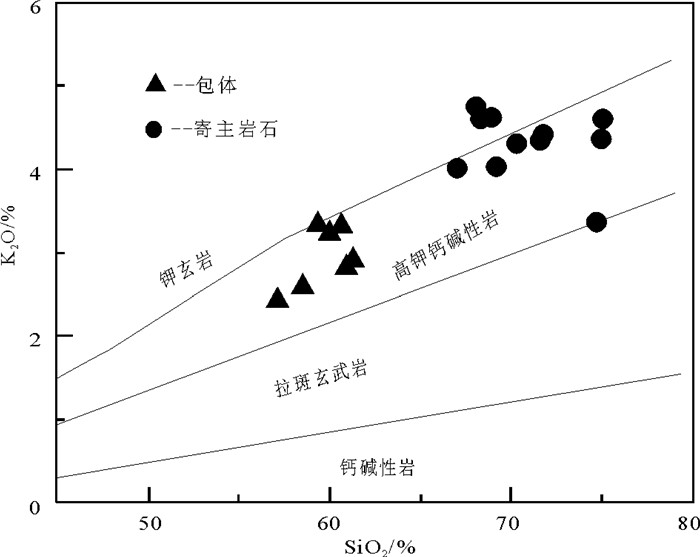 图 3 包体及寄主岩石SiO2-K2O图(郭晓冬等,2011) Figure 3 SiO2-K2O diagram of enclaves and host rocks(after Guo et al., 2011) |