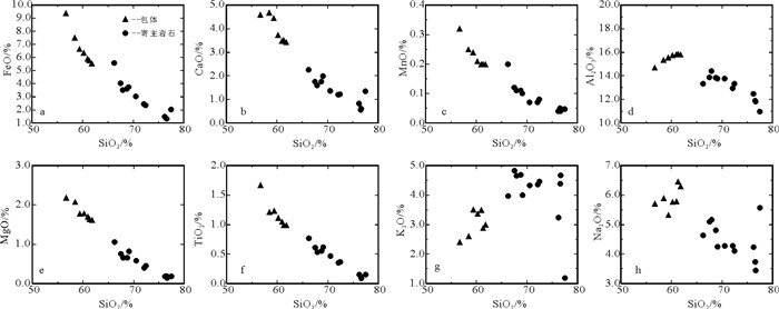 图 4 暗色包体与寄主岩石SiO2与主要元素协变图 Figure 4 Compositional variation diagrams of the dark enclaves and host rocks |