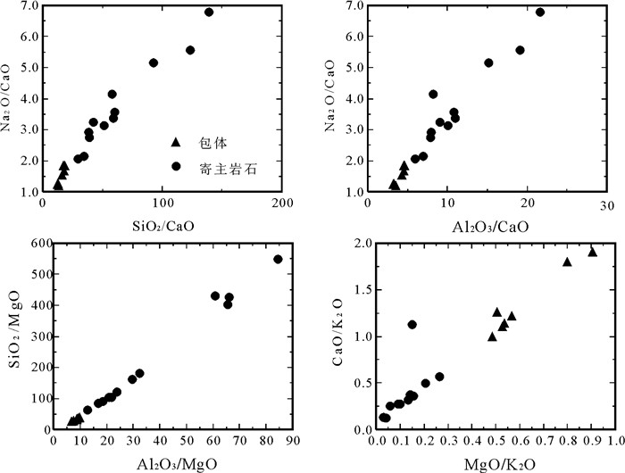 4 包体地球化学、同位素组成 4.1 主量元素暗色包体地球化学分析结果见表 1,为了便于对比,引用了寄主岩石(二长花岗岩、似斑状花岗岩和花岗闪长岩)的主量、微量及Sr-Nd同位素结果(余吉远等,2013)。在主量元素上,岩体中暗色岩浆包体的SiO2=56.72% ~61.80%,CaO=3.42% ~ 4.68%,明显比寄主岩石SiO2=66.29% ~77.47%,CaO=0.55%~2.26%更加偏基性。包体的全碱含量(K2O+Na2O=8.12%~10.55%)比寄主岩石的(K2O+ Na2O=6.75% ~9.93%)要高,里特曼指数σ =4.59~ 4.85,较寄主岩石σ =1.32~4.02偏碱性。包体A/NKC=1.16~1.24,寄主岩石A/NKC=1.19~1.50,总体上较为接近,均为过铝质岩石。同时,包体的K2O/ Na2O=0.42~0.66;而寄主岩石的K2O/Na2O=0.21~ 1.36,除一个样品较低外,总体上接近或大于1。包体在SiO2-K2O图上显示为高钾钙碱性系列(图 3),而寄主岩石主体显示为高钾钙碱性-钾玄岩系列。同时他们的SiO2与TiO2、FeO、MgO、CaO、MnO、Na2O、K2O具有良好的线性关系。除了K2O随SiO2的增加而增加外,其他TiO2、FeO、MgO、CaO、MnO、Na2O随SiO2的增加而减少(图 4)。在Al2O3/CaoNa2O/CaO,SiO2/CaO-Na2O/CaO,Al2O3/MgO- SiO2/ MgO,MgO/K2O-CaO/K2O的同分母双比值协变图(图 5)显示,包体和寄主岩之间具有良好的线性关系。莫宣学等(2006)认为岩浆混合作用可以通过岩浆作用的元素和同位素地球化学特征表现出来。这两种协变图中线性变化反映了包体及寄主岩石成分的变化与岩浆的混合作用有关,包体是岩浆混合作用的产物(周珣若,1994)。