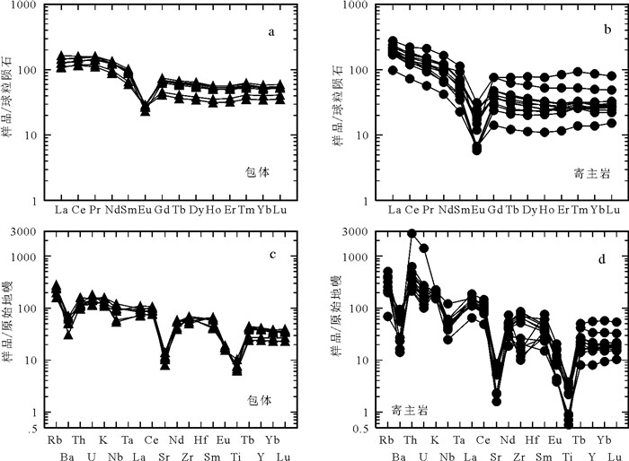 从包体及寄主岩稀土元素组成及相关特征参数(表 1)和稀土元素配分模式(图 6a、b)可以看出:包体稀土元素总量较高,∑ REE为294.73 × 10-6~ 426.38×10-6,平均为379.82×10-6; 轻稀土元素富集,LREE为245.27×10-6~347.50×10-6,平均为305.96× 10-6; LREE/HREE为3.73~4.96,(La/Yb)N为2.28~ 3.24,δEu=0.3~0.54、δCe=0.99~1.05,表现为明显的负铕异常,几乎没有铈异常; 相对于暗色包体,寄主岩石的稀土特征值略微偏低,∑REE为315.45×10-6~ 396.45 × 10-6,平均为347.28 × 10-6,LREE/HREE为5.92~7.59,(La/Yb)N为5.26~7.57(均大于4.3),反映具有LREE丰度相对较高的壳源物质参与岩浆作用的特点(董国臣等,2011)。δEu = 0.28~ 0.41、δCe = 0.82~0.86,亦表现出较明显的负铕异常和微弱的铈异常。由图 6可见,包体和寄主岩石的标准化曲线十分相似,它们均表现了轻稀土富集、重稀土平缓的曲线,弱的铕异常。稀土分配曲线型式的整体形态一致,说明它们在成因上有一定的亲缘关系。