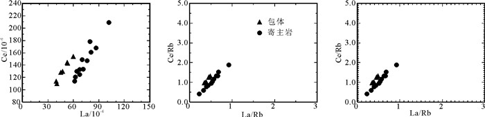 由包体及寄主岩微量元素分析结果(表 1)及微量元素原始地幔标准化蛛网图(图 6c、d)可以看出:相对于原始地幔,包体及寄主岩石微量元素含量均相对富集,Nb、Sr、Ti元素亏损,其中Rb、Th、U、K、La、Ce强烈富集,wB(岩石) /wB(原始地幔)>100; Nd、Hf、Zr、Sm、Tb、Y、Yb、Lu显著富集,10<wB(岩石)/ wB(原始地幔)<100;而Eu则轻微富集,1<wB(岩石)/ wB (原始地幔)<10,表明微量元素在演化过程中发生了明显的分异。相对于寄主岩的似斑状花岗岩,Cr、Ni的含量总体较高,而Ta的含量变化要大,介于1.55~3.01,并表现为从包体向寄主岩有降低的趋势。从微量元素蛛网图(图 6c、d)可以看出,相对于原始地幔,它们明显富集大离子亲石元素(LILE) Rb、U、Sr和Ba及高场强元素(HFSE) Nb、Zr和Hf。包体曲线中出现明显的Ba、Sr、Ti槽和微弱的Nb-Ta槽(图 6d),而寄主岩中出现明显的Ba、Sr、Ti槽、Nb-Ta槽(图 6c)。总体上,二者在蛛网图中的曲线整体形态相似,反映包体微量元素含量与寄主岩石相当。已有的研究表明,同源岩浆的Nb/Ta值相同,在没有外来物质加入的前提下,岩浆演化的Nb/ Ta值可以保持一个定值(王晓霞等,2005)。而本次测得包体的Nb/Ta值为18.78~23.43,比富集地幔的Nb/Ta值(17.7)要高(Sun et al., 1989), 寄主岩的Nb/ Ta值为13.21~16.67,比下地壳的Nb/Ta值(8.3)明显偏高Rudnick,2003;同时微量元素相关图和同分母比值图上呈直线(图 7),这也说明包体岩浆与花岗质岩浆是有联系的,它们之间存在相互混合的关系。这与Nb、Sr、Ti元素亏损代表反映岩浆不同程度地受壳源物质的混染相吻合(董国臣等,2011)。