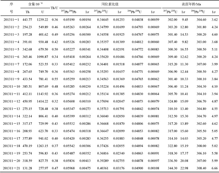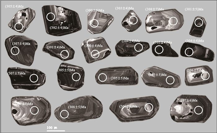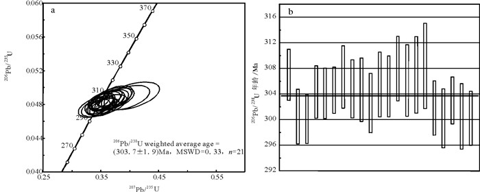 表6中206Pb/238U年龄数据集中分布于300.1~ 308.4 Ma,所有数据点基本投影在谐和曲线上或其附近(图 9a),用Isoplot 2程序计算得到包体中锆石21个点的206Pb /238U加权平均年龄为(303.7±1.9) Ma (n=21,MSWD =0.33) (图 9b),可能代表了该暗色包体的成岩年龄。