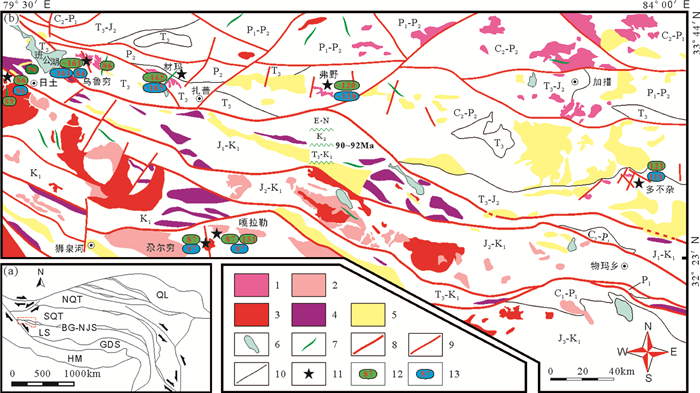 图 1 班公湖—怒江成矿带西段地质矿产简图(据佘宏全等,2009;张璋等, 2011, 2015;吕立娜等,2011;姚晓峰等,2013;祝向平等,2015;李志军等,2011;李华亮,2014;张硕等,2014) 1—班—怒带北侧中侏罗世—早白垩世岩浆岩;2—班—怒带南侧早白垩世岩浆岩;3—班—怒带晚白垩世岩浆岩;4—蛇绿构造混杂岩;5—K2-N地层;6—湖;7—基性岩脉;8—主断裂;9—次级断裂;10—地层界线;11—矿床(点)位置;12—矿区岩浆岩年龄(Ma);13—成矿年龄(Ma);C1-P1—下石炭统—下二叠统地层;C2-P1—上石炭统—下二叠统地层;C2-P2-上石炭统—上二叠统地层;P1-P2-下二叠统—上二叠统地层;P1—下二叠统地层;P2—上二叠统地层;T3—上三叠统地层;T3-J2—上三叠统—中侏罗统地层;T3-K1-上三叠统—下白垩统地层;J1-K1—下侏罗统—下白垩统地层;J2-K1—中侏罗统—下白垩统地层;J3-K1—上侏罗统—下白垩统地层;K1—下白垩统地层;HM—喜马拉雅地体;GDS-冈底斯地体;LS-拉萨地体;SQT-南羌塘地体;NQT—北羌塘地体;QL—祁连地体;BG—NJS—班公湖—怒江缝合带 Figure 1 Sketch geological map of the Bangong Co-Nujiang River metallogenic belt showing distribution of mineral deposits 1-Magmatite of Middle Jurassic and early Cretaceous in the north of Bangong Co- Nujiang mineralization belt; 2-Magmatite of Early Cretaceous in the south of Bangong Co- Nujiang mineralization belt; 3-Magmatite of Late Cretaceous in the Bangong Co- Nujiang mineralization belt; 4- Ophiolitic melange; 5-Strata of K2-N; 6-Lake; 7-Mafic dikes; 8-Main fracture; 9-Secondary fault; 10-Stratigraphic boundary; 11-Location of ore deposit (ore spot); 12-Age of magmatic rocks in the mining area (Ma); 13-Mineralization age (Ma); C1-P1-Lower Carboniferous to Lower Permian; C2-P1-Upper Carboniferous to Lower Permian; C2-P2-Upper Carboniferous to Upper Permian; P1-P2-Lower Permian to Upper Permian; P1-Lower Permian; P2-Upper Permian; T3-Upper Triassic; T3-J2-Upper Triassic to Middle Jurassic; T3-K1-Upper Triassic to Lower Cretaceous; J1-K1-Lower Jurassic to Lower Cretaceous; J2-K1-Middle Jurassic to Lower Cretaceous; J3-K1-Upper Jurassic to Lower Cretaceous; K1-Lower Cretaceous; HM-Himalaya terrane; GDS—Gangdese terrane; LS-Lasha terrane; SQT-South Qiangtang terrane; NQT-North Qiangtang terrane; QL-Qilian terrane; BG-NJS-Bangonghu-Nujiang suture |