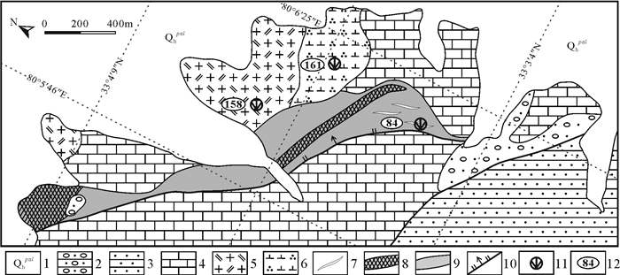 图 2 乌鲁穷磁铁矿矿床地质简图 1—全新世洪冲积物;2—古—始新统牛堡组(E1-2n)砾岩;3—上三叠统日干配错群一组(T3R1)砂岩;4—上三叠统日干配错群二组(T3R2)灰岩;5—二长花岗岩;6—石英闪长岩;7—碳酸盐脉;8—矿体;9—矿化带;10—正断层;11—测年位置;12—测年结果(Ma) Figure 2 Sketch geological map of the Wuluqiong iron deposit 1-Monzonitic granite; 2-Quartz diorite; 3-Riganpeicuo Group limestone in Upper Triassic (T3R2); 4-Riganpeicuo Group sandstone in Upper Triassic (T3R1); 5-Niubao Group in Paleocene to Eocene (E1-2n) conglomerate; 6-Diluvial deposit and alluvial deposit in Holocene; 7-Orebody; 8-Mineralized zone; 9-Carbonate vein; 10-Normal fault; 11-Dating location; 12-Dating results (Ma) |