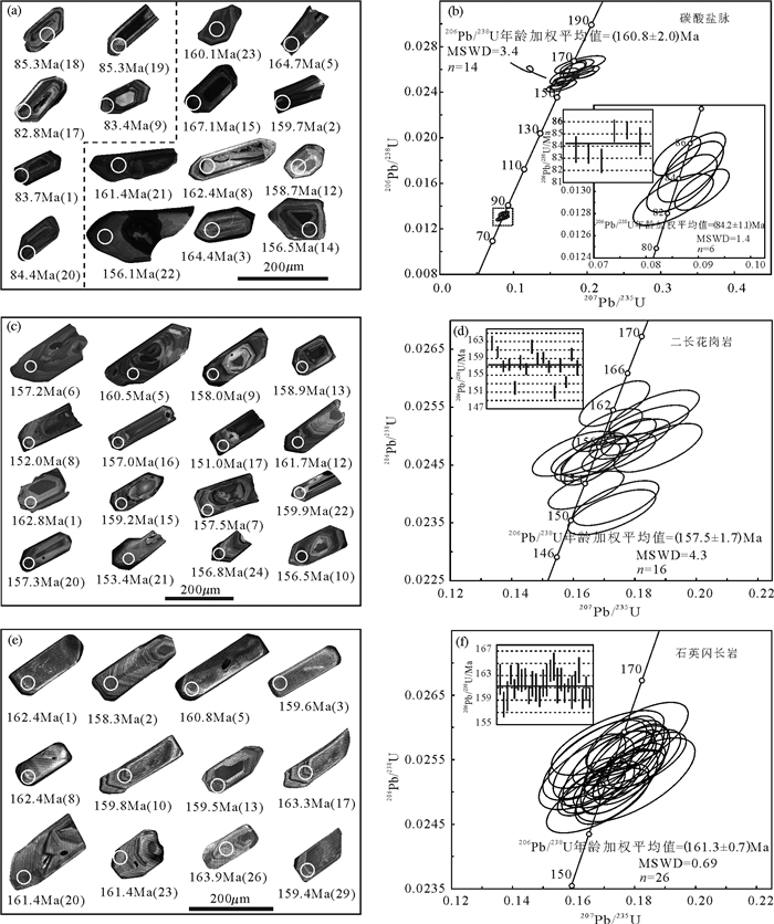 图 4 乌鲁穷同构造碳酸盐脉、二长花岗岩、石英闪长岩锆石阴极发光(CL)图像(a, c, e)和U-Pb年龄谐和图(b, d, f) Figure 4 Cathodoluminescence (CL) images (a, c, e) and U-Pb concordia diagrams (b, d, f) of zircons in the isostructural carbonate veins, adamellite and quartz diorite |