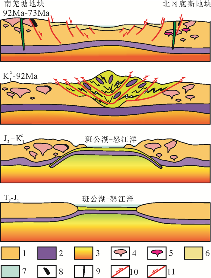 图 5 班公湖地区中生代构造演化与成矿演化模式图 1—地壳;2—岩石圈地幔;3—软流圈;4—中侏罗世—早白垩世岩浆岩;5—晚白垩世岩浆岩;6—竟柱山组磨拉石建造;7—水;8—铁矿体;9—辉绿岩脉;10—逆断层;11—正断层 Figure 5 Tectonic evolution and metallogenic evolution in Bangong Lake zone in Mesozoic 1-Crust; 2-Lithosphere mantle; 3-Asthenosphere; 4-Magmatite of Middle Jurassic and Early Cretaceous; 5-Magmatite of Late Cretaceous; 6-Molasse formation of Jingzhushan Group; 7-Water; 8-Iron orebody; 9-Diabase dyke; 10-Reverse fault; 11-Normal fault |